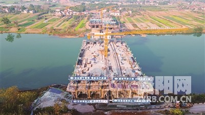 目前,由中国十九冶集团有限公司承建的蜀都大道东延线资简段建设工程(文龙寺至蜀乡大道段)已完成总工程量的55%,其中董家坝沱江特大桥引桥部分正在进行下部结构施工,主桥已完成工程量的50%;两河口沱江特大桥主桥已完成工程量的85%,下部结构施工完成,引桥预制小箱梁架设完成15%,全力实现年前右幅主、引桥贯通;阳化河大桥正在进行桥面系施工作业。图为董家坝沱江特大桥。