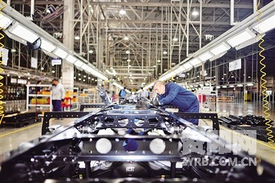2023年,现代商用汽车(中国)有限公司实现产值4.4亿元、同比增长72.2%,生产的“盛图”氢燃料电池商用车不仅顺利实现首批量产,更是一举斩获大宗订单,并成功交付出口沙特阿拉伯500辆、2亿元的创虎重卡订单。图为节后的现代商用汽车生产车间内,工人正在组装汽车底盘。全媒体记者 张建 摄