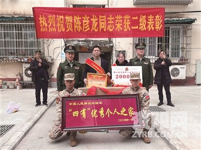 “祝贺!祝贺!”“太了不起了!”上午9点40分左右,在街坊邻里的祝贺声和喜庆热闹的锣鼓声中,慰问组一行来到现役军人陈彦龙家中,当众宣读表彰喜报、介绍陈彦龙同志立功事迹,为陈彦龙的家属佩戴“二级表彰先进个人家属”绶带,送上“中国人民解放军陆军‘四有’优秀个人之家”牌匾、慰问品和奖励金,感谢他们为部队培养了优秀人才,为国防事业作出了突出贡献。