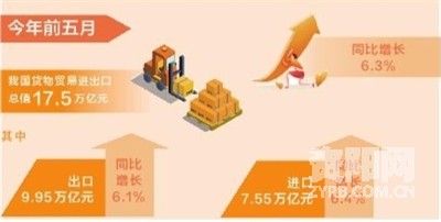 人民日报北京6月10日电(记者 欧阳洁)记者近日从海关总署获悉:今年前5月,我国货物贸易进出口总值17.5万亿元,同比增长6.3%。其中,出口9.95万亿元,同比增长6.1%;进口7.55万亿元,同比增长6.4%。今年以来,我国经济运行持续回升向好,外贸向好势头不断巩固。5月当月,我国进出口同比增长8.6%,月度增速进一步加快。