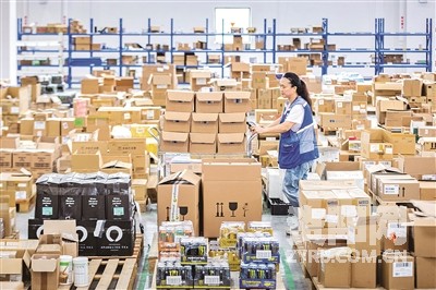 时值电商平台“618”年中促销活动高峰,各地电商、物流等线上线下企业、商家全力应对。图为6月18日,在浙江省温州综合保税区京东仓内,工作人员按照订单配送货品。新华社发(刘吉利摄)