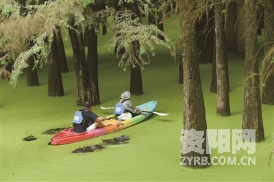 初秋时节,杭州青山湖水上森林近百亩池杉、落羽杉和水面的浮萍相映成趣,呈现出幽静的生态景观。图为9月4日,游客在水上森林泛舟。