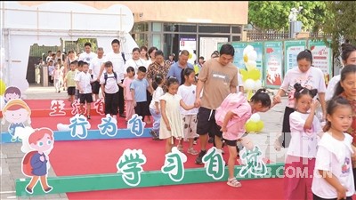 迎新典礼上,一座精心设计的“逐梦·启航一起向未来”大门矗立在校门口。一年级新生在家长的带领下,有序通过这座充满希望的大门,然后依次跨过“生活自理”“行为自律”“学习自觉”“文明自信”“人格自强”五道寓意深刻的门槛。每跨过一道门槛,就象征着一次进步,孩子们小脸上写满了喜悦。