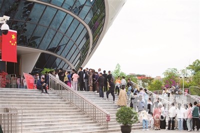 国庆假期,我市文旅市场活力十足,不少群众来到资阳市博物馆等景点参观游览。图为10月2日下午2点左右,资阳市博物馆门前市民排队入馆参观。