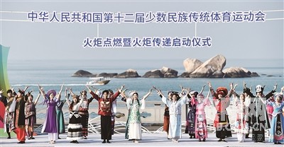 10月9日,中华人民共和国第十二届少数民族传统体育运动会火炬点燃暨火炬传递启动仪式在三亚市天涯海角举行。本届运动会将于11月22日在海南三亚开幕,共有来自全国各地的35支代表队,56个民族的约7000名运动员参赛,比赛包括18个竞赛项目以及约170个表演项目。这是10月9日拍摄的仪式现场。 新华社记者 杨冠宇 摄
