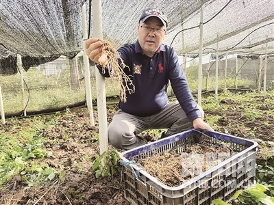 裘建华展示丰收的三七。