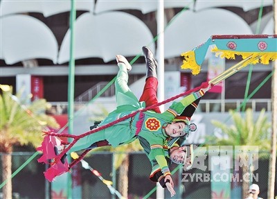 11月24日,青海队选手表演土族轮子秋。 当日,第十二届全国少数民族传统体育运动会表演项目(室外)在海南省三亚市举行。 新华社记者 陈朔 摄