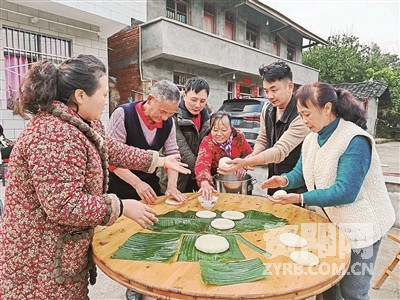 1月28日下午,安岳县乾龙镇孟公村7组村民唐德英家,几户相邻村民一起打糍粑迎春节。