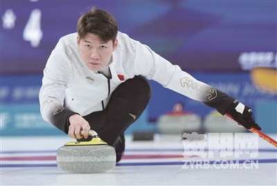 ④2月6日,中国队选手王智宇在比赛中。冰壶混双循环赛B组第8轮比赛中,中国队10比1战胜卡塔尔队。