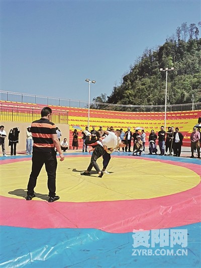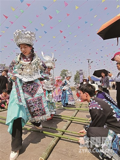 媒体代表们下车伊始,热情苗歌响起,拦门酒送上美好祝愿;热闹的“竹竿舞”跳起来,点燃了现场的热情。