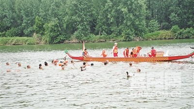 本报讯(全媒体记者 李好)沱江之上,鼓声震天,浪花飞溅,龙舟如“离弦之箭”破浪疾驰。欢呼声里,一群鸭子惊慌四散,游泳爱好者们纷纷跃入水中,展开一场激烈的抢鸭大战。