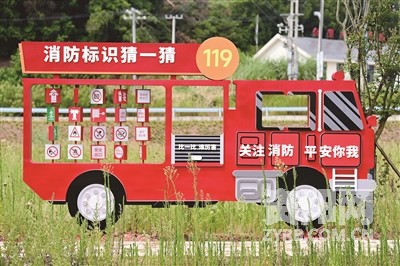 走进仁里村,消防车造型的“消防标识猜一猜”游戏区格外显眼。该标识牌采用双层翻转设计,正面展示各类消防标识,背面即是对该标识含义的详细解读,群众只需轻轻翻转,就能实现“一问一答”的互动体验。此外,沿小径设置的“FIRE”“小火不怕,提拔握压”等景观造型,也让消防安全“转角可见、触手可学”。