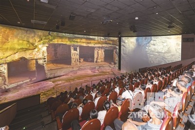 游客在安岳石窟数字展示中心观看特种电影《山岳颂安》。