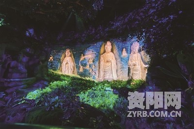 “道法自然”里,老子、庄子和张道陵的人生故事通过幻影成像、全息投影等先进技术,将道家哲学转化为可感知的光影世界;“石窟奇遇”让安岳佛像“动”起来,伸手可触千年石纹。