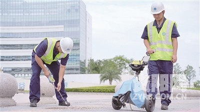 在离调压柜不远的人行道上,刘西洋手持灵敏的燃气测漏仪,如同一位专注的“扫描师”,对着沿途每一个窨井盖缝隙进行扫描探测。谢天则推着手推式燃气地面检漏仪,在重点区域进行更细致的检测。烈日炙烤着路面,热气从脚下升腾。他们走走停停,不时蹲下身子,将探头伸入窨井盖的缝隙中仔细检测,每次低头都伴随着汗珠滴落。这份看似枯燥的“地毯式”巡查,是预防燃气泄漏、保障城市地下安全的关键防线。