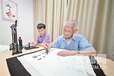 廖锦轩陪96岁的闫明清爷爷写书法。