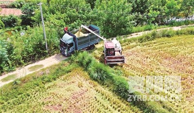 9月3日下午,丹山镇金灿灿的稻田里,空气中弥漫着稻香。农技人员熟练地驾驶着收割机,在稻浪间穿梭作业。收割完后,便将稻谷运到中心及时晾干。