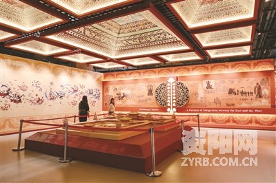 9月21日,以“加强文化交流,促进文明互鉴”为主题的第八届丝绸之路(敦煌)国际文化博览会在甘肃省敦煌市开幕。 图为与会嘉宾在第八届丝绸之路(敦煌)国际文化博览会上参观敦煌文化主题展。 新华社记者 郎兵兵 摄