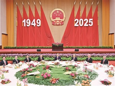 人民大会堂宴会厅华灯璀璨,洋溢着喜庆热烈的节日氛围。主席台上方高悬着庄严的国徽,“1949-2025”大字年号在鲜艳红旗映衬下格外醒目。