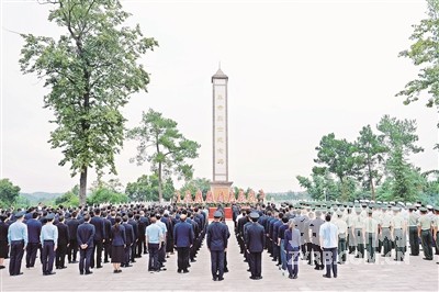 天地英雄气,千秋尚凛然。苍松翠柏掩映的烈士陵园庄严肃穆,革命烈士纪念碑巍然耸立。纪念碑前,由市委,市人大常委会,市政府,市政协,驻资解放军和武警部队,各民主党派资阳市委会、市工商联和无党派人士代表,雁江区四套班子和市区各人民团体及各界群众,烈士遗属和老战士及退役军人代表,中国少年先锋队敬献的9个大型花篮一字排开,花篮红色缎带上书写的“烈士永垂不朽”格外醒目。各界干部群众代表列队整齐,面向纪念碑肃然站立。