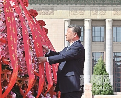 习近平迈步上前,仔细整理花篮缎带。随后,习近平等党和国家领导人缓步绕行,瞻仰人民英雄纪念碑。