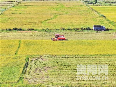 10月11日,湖南省常宁市洋泉镇农民驾驶收割机在收获水稻(无人机照片)。