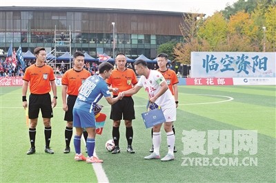 下午3点半,四川音乐学院临空经济区校区美术学院足球场座无虚席。看台上,“资阳雄起”标语旗挥舞,蓝红方阵交织,呐喊声震耳欲聋。