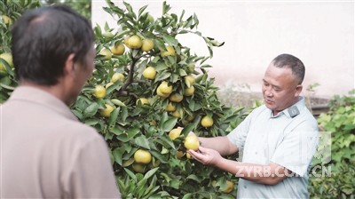 刘树文是丰裕镇敲钟村人,1997年,在外打工的他回乡创业,但一开始并不顺利。了解到蜜柑行情好后,他将目光聚焦到了这一产业上。但刚开始,他家的蜜柑一年亩产只有两三千斤。2008年的一场变故又让他遭遇了重大挫折。那一年,前期干旱后期多雨,蜜柑的甜度不够、销路不好,单价从一块多降到了两角多。2009年他发现,直径65到85mm的蜜柑糖度和大小,更受市场欢迎。