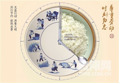 《尊重劳动》以巧妙的视觉设计打动评委。作品将餐盘创意转化为“时间表盘”,巧妙地融合农耕劳作场景与计时元素,通过“一粒米成熟需 3072小时,浪费仅需一秒”的强烈对比,直观呈现了粮食从耕种到收获的漫长历程,深刻传递了“尊重劳动成果、践行光盘行动”的文明理念。这种将抽象的节约意识转化为具象视觉冲击的创作手法,既极具艺术感染力,又兼具现实引导意义。