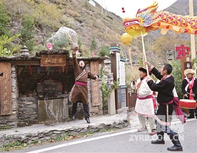 图为11月18日,在茂县赤不苏镇,当地群众沿街舞龙,迎接羌年的到来。