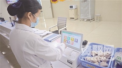 护士指引操作“床旁结算”系统终端。见习记者 唐朕 摄