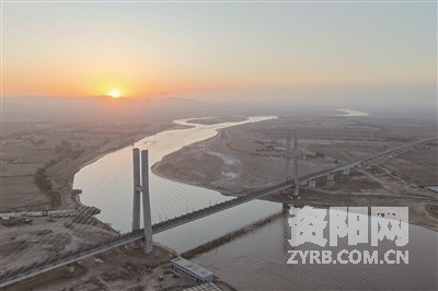 图为在日出时分拍摄的包银高铁乌海黄河特大桥。