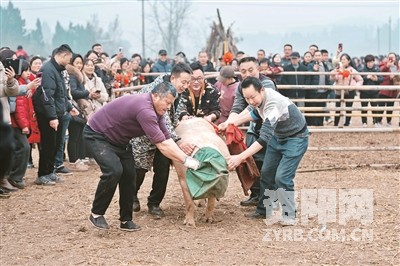 1月15日,安岳县通贤镇帽石村“刨猪宴”如期举行。上万游客云集,挑战抓鸡鸭鹅、品“刨猪宴”,让这个平日里静谧的乡村变成了欢乐的海洋。