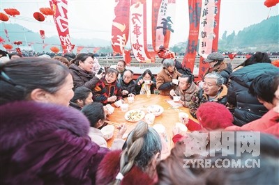 席间既有本地乡亲,也有不少专程从重庆、成都等地赶来的游客。游客凡婷婷端着碗,脸上洋溢着满足的笑容:“年味特别足!这么多人聚在一起吃饭团年,感受真的很不一样,吃起来更香了。”她笑着说,“这样的氛围,真的幸福感爆棚。”