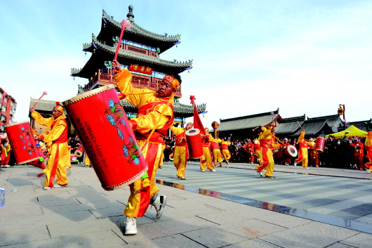 3月28日,兰州新区太平鼓表演队来到天水,用激昂的鼓点为天水麻辣烫加油助威。 当天下午,太平鼓队在秦州区龙城广场、自由路玉兰古巷、天水古城启汉楼广场、伏羲城东牌坊前进行了集中和行进式表演。表演现场被观众层层围起,鼓手们身穿红黄相间的演出服、肩挎太平鼓,时而高举、时而下落,双手持鼓槌击打印有太极图的鼓面,鼓点铿锵、喊声高亢,现场气氛热烈。 新天水·天水日报记者 孙镇 摄