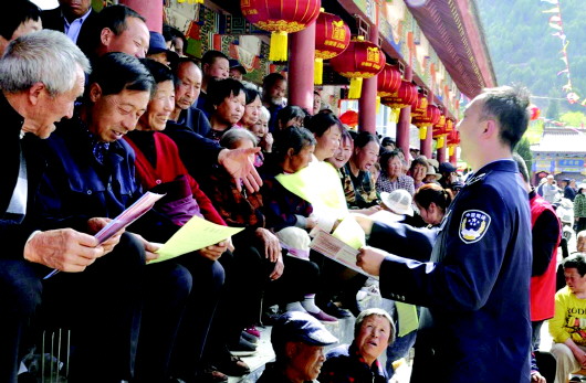 麦积区司法局日前在元龙镇井儿村开展全民国家安全教育日主题宣传活动。当天正值元龙镇井儿村农历“三月三”庙会,司法干警与普法志愿者通过悬挂横幅、发放宣传资料、现场讲解等方式,以“总体国家安全观·创新引领10周年”为主题,向群众开展国家安全法律意识教育,引导群众认识到国家安全教育的重要性,使群众在潜移默化中了解认识并自觉维护国家安全。 宗禾 摄