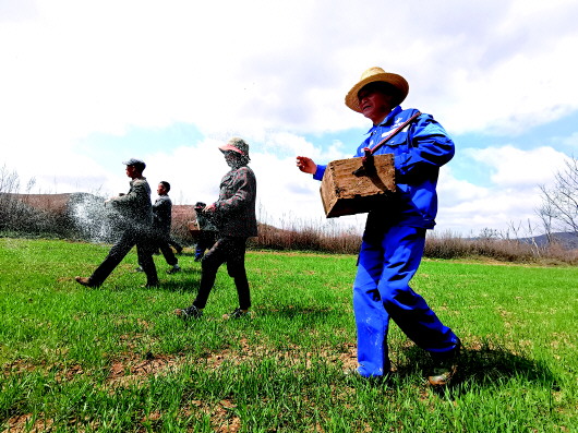 4月23日,在清水县新城乡四合千亩小麦良种繁育基地,农户抢抓雨后墒情有利时机,适时对小麦施肥,促进麦苗早发快长,为夏季小麦丰产丰收作准备。新城乡四合千亩小麦良种繁育基地以“兰天211”小麦品种为主,种植面积1200亩。新天水·天水日报记者周文涛 摄