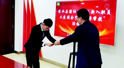 本报讯 近日,清水县信用联社举办2024年新入职员工座谈会暨“导师带教”拜师活动。 座谈会上,联社负责人向新员工介绍了联社的基本情况,宣读了新员工分配工作通知,新员工依次作了自我介绍,大家共同诵读了古代典籍《论语》节选内容,5名新员工分别向导师呈拜师贴、行拜师礼。 拜师仪式结束后,新员工代表和导师代表作了发言。新员工代表表示将端正态度、严于律己、勤学好问、尽快成长。导师代表承诺将言传身教、率先垂范、教学相长、共同进步。谆谆誓词,许下师徒结对之约,尽显薪火相传之美。 最后,联社负责人总结发言,对新员工提出殷切期望和要求。 青春逢盛世,奋斗正当时。座谈会的召开有效引导新入职员工快速找准位置,找对方向,学会以清醒的认识面对困难,以坚毅的意志迎接挑战,以聪明和智慧推动发展,为清水县信用联社高质量转型发展增添新的活力。 (毕云霞)