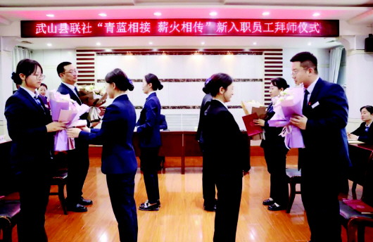 ▲为帮助新员工更好地适应从校园生活到职场的角色转变,充分发扬农信人薪火传承、赓续前行的优良传统,日前,武山县信用联社举行了2024年新入职员工拜师仪式。 拜师仪式上,新入职员工向导师呈拜师帖、行拜师礼、送手捧花,表示将谨遵师训,刻苦学习。导师向新入职员工赠送甘肃农信规章制度书籍,并承诺将当好表率,倾囊相授。 骆菁 摄