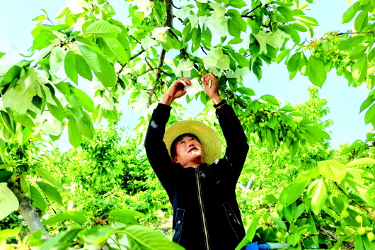 5月15日,在秦州区中梁镇红卫村,果农正在樱桃园内给大樱桃套袋。给樱桃套袋可以起到樱桃病虫害防治的作用,延长樱桃生长期,产出的大樱桃不仅色泽鲜亮、个头大、品相好,且比普通大樱桃更甘甜可口。 新天水·天水日报记者 李旺旺 摄