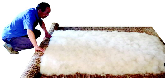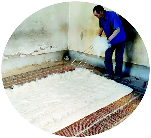 □ 祝贺 没有毛毯以前,毛毡成为古时高寒地区的过冬必备。宋元时期,擀毡技艺从内蒙古游牧部落传入多民族聚居的西北地区。2008年,甘肃临夏东乡族的擀毡技艺,入选第二批国家级非物质文化遗产名录。 如今,甘谷县新兴镇三合村张家庄,依然传承古老的擀毡手艺。其质朴耐用的毛毡,保暖隔湿、不易燃,沿用至今。 在甘谷县,人们都夸说,张家庄的毡——新兴镇各个擀毡村落里,张家庄的毛毡擀得最好。 沿陇海铁路向东,走上一段就到了张家庄,和天水别的村子没有区别。 遇见张建伟时,是一个下午,夏天的阴云凉爽沉闷。他年近五旬,脸庞干瘦,头戴一顶旧解放帽,帽檐上落了几缕羊毛,粘着。 他站在院子当中,双手叉腰,一只脚用力踩踏竹席来回滚动,用心擀着毡。毡房内,仅有一架擀毡机,一把弹弓,几根长短不一的木棒,一张竹条粗席和几根细竹棍。 我站在一旁看他忙活,与他说话,他则用甘谷方言跟我搭腔。 “毡匠3件宝,弹弓、竹帘、沙柳条。”工具虽简单,工序却复杂。从选毛、称毛、弹毛、打毛、压毛、铺毡、擀毡、洗毡、晾毡,再到弹、洗和揉边,技术性很强。 张建伟说,擀毡选毛有讲究,甘谷羊毛的毛质细、绒毛多,粘性差且不易粘合,只能少量掺杂。麦积区甘绒厂、临夏三甲集和新疆的粗羊毛粘性好、杂质少。新西兰的虽然好,但太贵所以只用过几年。另外,羊毛里的杂质,诸如沙子、土、羊粪等,还要筛选干净。 他一边介绍一边演示,先用白土揉进羊毛,吸掉油气,再用弹弓加工松软,并用手拍打铺放均匀。擀毡前,还要撒面粉,通常中等大小的毛毡掺两斤多面粉,以增加黏性和柔性。之后还要淋上开水,高温瞬间会使羊毛变软。 坐在毡房的长条凳上,张建伟用手牵着毡棒两端的绳子,脚蹬一双解放胶鞋,用劲滚踩竹席卷起的毛毡,随着木棒来回滚动,毛丝结片紧缩、粘合密实。 擀好后,提壶开水倾洒在毡上,待浇透了,再用脚踩着使劲洗揉,毛毡里的面汁便不断被挤出。洗过的毡,面粉越少,品质就越好。 “咋样才能擀好?”我问。 “要有力气,还要技巧。”张建伟说,铺羊毛多用手凭感觉,薄厚均匀,擀出来才平坦。传统手工毡很瓷实,能保持几十年厚度不变。机器擀得就虚,用上几年便会越来越薄。尤其最后一道揉弄毡边的工序最讲究,因为参差不齐的毡边不能用剪刀裁齐,只能靠手工揉弄,没有丰富的经验和高超的手艺,根本无法做出笔直带棱的毡边。 张家庄的毛毡结实、美观、耐用、光洁、平齐、隔潮、保温、弹性好,颜色有白、黑、麻,尺寸除固定大小外,还可根据要求定做。 天水历史上属羌、汉杂处地区,畜牧业发达,畜毛加工业亦兴盛发展。以前,天水许多县区都有工艺精湛的擀毡艺人。茜毡是在白毡上做染色的工艺,现已失传。秦州区西关的南、北茜毡巷,地名沿用至今。从业最久的北茜毡巷高姓,自明代始创,还有崔姓等几家毡房,到20世纪30年代初先后歇业,如今已荡然无存。 20世纪七八十年代,三合村全村百分之八十以上的人从事擀毡业,成为西北少有的擀毡专业村。这里有不少擀毡高手采用传统工艺,所出产的毛毡质量上乘,很受欢迎。到20世纪80年代,当地擀毡业发展迅速,逐步走向商品化、专业化、批量化,产品很快打入西北各地市场,成为甘谷支柱产业。 当时,走进三合村,犹如进入了毛毡的海洋,耳朵听到的是轰隆隆的弹毛机器声,啪啪啪的打毛声,噗噗噗的喷水声;眼睛看到的是团团滚动的羊毛,一片片洁白的毛毡;鼻子嗅到的是羊毛特有的气味。全村60多户擀毡专业户在旺季月产毛毡5000多片,消耗各类羊毛60多吨,收入颇丰。 每到寒冬旺季,陕西、青海、宁夏、新疆及省内外各地的客户时常上门催货,这时家家户户便白天黑夜连轴转,以至于影响到邻近的几个村子也开始学擀毡,带出了十几户专业户。那时,擀毡专业户过年贴在门上的春联:“毛静毛动,毛里刨金;土进土出,土中作乐”,可谓惟妙惟肖地刻画出了手艺人喜悦的心情。 张建伟的擀毡手艺,是从清朝开始,祖上五代人代代传承至今的。平时他就利用农闲做一点,虽说很辛苦,但夫妻俩一起干,早年用脚踩,现在用机器擀,省力且高效,每天还能多擀一两张。 喝一口罐罐茶,张建伟淡淡一笑说,手工擀的羊毛毡能用五六十年,隔湿效果非常好,去南方上大学的学生,都喜欢小毡褥子。老年人冬天将毛毡铺在火炕上,暖和不易燃。有人曾专程找到他,为长辈定做过一张500多元的毛毡。“经常用对皮肤好,而且毛毡方便保存,只要撒点药水就能防虫。用久了、脏了,将洗衣粉、洗涤剂倒在毡上,用水管冲洗即可。” “市场前景咋样?”我问。 “毛毯对毛毡的冲击很大。”张建伟说,毛毡能铺不能盖,销路多在农村、县城,而毛毯干净美观,能铺又能盖,在城乡都有市场。现如今,每年擀毡的销量,只有从前没有毛毯时一天的量,而且同样大小的毛毡和毛毯,价格上也大相径庭。 “早年毛毡多销往天水,现今却是外地客商要得较多,有位临洮的客商,20多年了,每年到村上收购,一次能收四五百张,一个多月就卖完了。”张建伟说,由于毛毡的成本和运费越来越高,利润却越来越少,所以现在擀毡的人也不多了。若想继续下去,今后还得改进工艺,争取擀出更加干净卫生的毛毡,着力向南方和国外宣传,或许销量还能提升。 甘谷曾经贫苦的自然环境以及传统质朴的技艺,潜移默化造就了手艺人节俭勤劳、诚实向善的淳朴品质,亦造就了