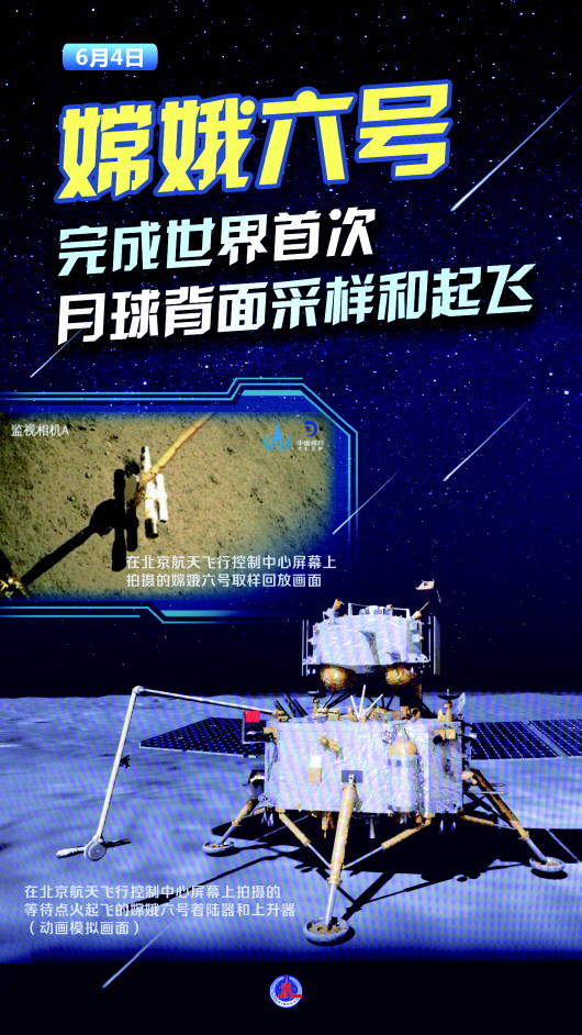 新华社北京6月4日电(温竞华、宋晨、蔡金曼)月背“挖宝”顺利结束,嫦娥六号启程回家! 6月4日7时38分,嫦娥六号上升器携带月球样品自月球背面起飞,随后成功进入预定环月轨道。嫦娥六号完成世界首次月球背面采样和起飞。 月球背面南极-艾特肯盆地,被公认为月球上最大、最古老、最深的盆地。在这里开展世界首次月背采样,对进一步认识月球意义重大。 6月2日至3日,嫦娥六号顺利完成在月球背面南极-艾特肯盆地的智能快速采样,并将珍贵的月球背面样品封装存放在上升器携带的贮存装置中,完成了这份宇宙快递的“打包装箱”。 从挖到取再到封装,一气呵成,干得漂亮!这源于敢为人先的创新设计—— “挖宝”主打“快稳准”。受限于月球背面中继通信时长,嫦娥六号采用快速智能采样技术,将月面采样的有效工作时间缩短至不到20个小时;同时,探测器经受住了月背温差考验,克服了测控、光照、电源等难题,通过钻具钻取和机械臂表取两种方式,分别采集了月球样品。 “取宝地”一次“看个够”。嫦娥六号着陆器配置的降落相机、全景相机、月壤结构探测仪、月球矿物光谱分析仪等多种有效载荷正常开机,服务月表形貌及矿物组分探测与研究、月球浅层结构探测、采样区地下月壤结构分析等探测任务。这些“火眼金睛”不但能“看清”月球,还能“看明白”月球。 月背之旅,拍照“打卡”不能少。着陆后,嫦娥六号着陆器和上升器组合体携带的“摄影小车”,自主移动并成功拍摄回传着陆器和上升器合影。 “做科研”凸显“国际范儿”。嫦娥六号着陆器携带的欧空局月表负离子分析仪、法国月球氡气探测仪等国际载荷工作正常,开展了相应科学探测任务;安装在着陆器顶部的意大利激光角反射器成为月球背面可用于距离测量的位置控制点。中方和合作方科学家将共享科学数据,联合开展研究,产生更多成果。 “挖宝”完成后,起飞分“三步走”。与嫦娥五号月面起飞相比,嫦娥六号上升器月背起飞的工程实施难度更大,在鹊桥二号中继星辅助下,嫦娥六号上升器借助自身携带的特殊敏感器实现自主定位、定姿。上升器点火起飞后,先后经历垂直上升、姿态调整和轨道射入三个阶段,顺利进入了预定环月飞行轨道。后续,月球样品将转移到返回器中,由返回器带回地球。 还有这鲜艳的一抹红——表取完成后,嫦娥六号着陆器携带的五星红旗在月球背面成功展开。这是我国首次在月球背面独立动态展示国旗。 “中国红”亦承载着人类的共同梦想。祝愿嫦娥六号归途顺利,我们在地球等你!
