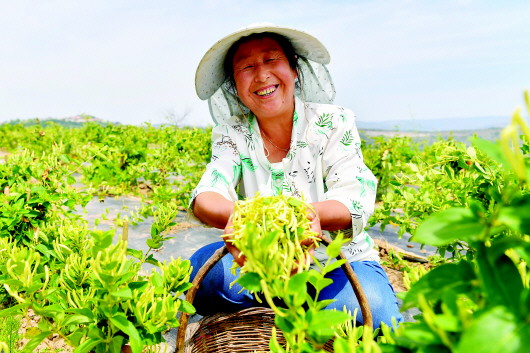 6月11日,清水县金集镇望日台金银花管护示范点,种植农户正忙着采摘金银花。金集镇栽植的1400亩金银花今年喜获丰收,预计能采摘鲜花7万余斤,为农民增收70万元以上,金银花正逐步成为当地群众增产增收的“黄金花”“致富花”。 新天水·天水日报记者 周文涛 摄