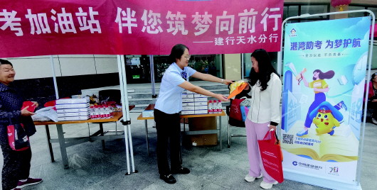 为了营造舒心舒适的考试环境,高考期间,建行天水分行志愿者在天水一中分校考点周围积极劝导考场周围的车主绕行,保持安静的考场环境,为考生备考和应考营造良好氛围。党员志愿者悬挂助力高考宣传横幅,摆放宣传折页,为等候考生的家长提供矿泉水、口罩、抽纸、手机充电器等爱心物品。同时,向大家普及反洗钱、反假币、个人征信和电子银行产品等金融知识。 杨波 摄