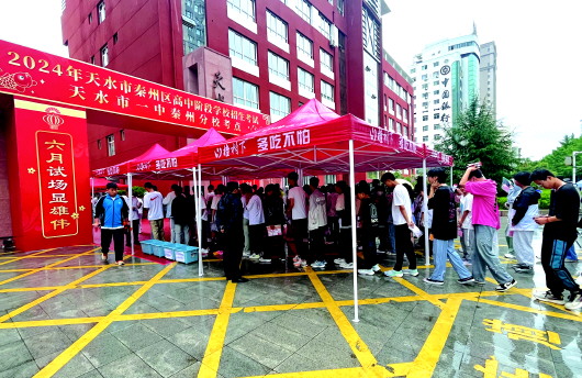 本报讯【新天水·天水日报记者鞠玮莉 马静】6月16日,为期3天的2024年天水市中考正式拉开帷幕,全市82719名考生迎来学生生涯中的第一次大考。 上午8点,记者在天水一中秦州分校考点看到,考生们依次排队,经过身份初验、随身物品检查和安全检查后进入考场。 为了给考生加油鼓劲,除了守候在外的家长,还有不少老师也来送考,给学子们送来嘱托和祝福。“我们带队老师会提醒学生带好学生证和准考证,祝参加考试的学子,中考顺利、一举夺魁!”天水市逸夫实验中学教师蒋鑫说。 今年中考,全市共设40个考点,2831个考场。为确保本次中考顺利进行,我市交警部门还配备了警车、摩托车应对处置考点突发情况,并及时对考点周边道路进行交通疏导,确保交通安全畅通,提醒驾驶员在考场周边禁鸣喇叭,为考生营造安全、舒心的考试环境。 除此之外,我市相关部门还积极联动实施中考护航行动,公安、综合执法、电力等部门都在考点外开展排查,为中考顺利进行提供安全保障。