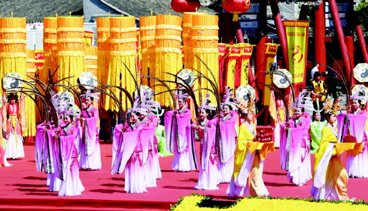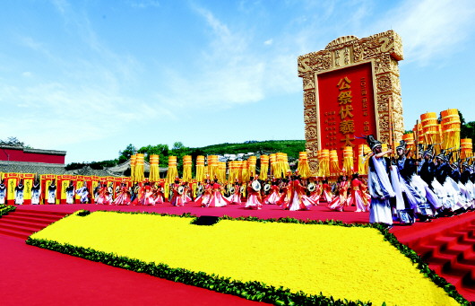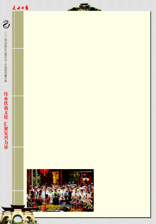 新天水·天水日报记者 周文涛 李旺旺 孙镇 陇山苍苍,渭水泱泱。羲皇德威,福泽绵长。 6月21日上午,2024(甲辰)年公祭中华人文始祖伏羲大典举行,中华儿女齐聚甘肃天水,祭拜中华人文始祖伏羲,表达怀远思古、追缅先祖的情怀。 伏羲广场花团锦簇、龙旗飘扬。远道而来的海内外宾朋身披黄色绶带,心怀虔诚之情静静伫立,共同迎接盛典。 伏羲庙内古柏苍苍、古乐悠悠。伏羲圣像庄严肃穆,人们以太牢、鲜花、雅乐之仪和虔敬之心,致祭中华人文始祖伏羲。 圣乐袅袅,舞姿绰约。祭祀乐舞《羲皇颂》的四个篇章《曦开迎圣》《厥功大德》《万代敬仰》《福佑中华》依次恢宏呈现,载歌载舞再现和追思伏羲“教垂万世,泽被八方”的大德伟业。 乐舞告祭后,嘉宾们走进伏羲庙敬献花篮,行鞠躬礼,瞻仰伏羲圣像。 伏羲文化是中华民族的本源文化和中华文明的重要源头,充满了创造精神、奉献精神、和合精神。此时此刻,海内外中华儿女的目光齐聚羲皇故里,感怀伏羲功绩、传承中华文明,表达对我们共同先祖伏羲的虔诚和敬仰,表达我们衷心期盼祖国繁荣昌盛、国泰民安的美好祈愿。