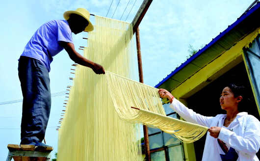 7月12日,麦积区石佛镇黄庄村村民在自家院落晾晒挂面。金灿灿、黄澄澄的挂面散发着浓郁的清香。 传承200多年的黄庄挂面,因制作精良、口味纯正等优势深受消费者的青睐,其制作工艺被列入非物质文化遗产名录。黄庄村400多户人家,有100多户以生产挂面为生。目前,石佛镇建成手工挂面生产企业12家,手工作坊220户,年生产挂面1000吨,年销售收入超过1600万元,手工挂面已成为助农增收的富民产业。 新天水·天水日报记者张文都 摄