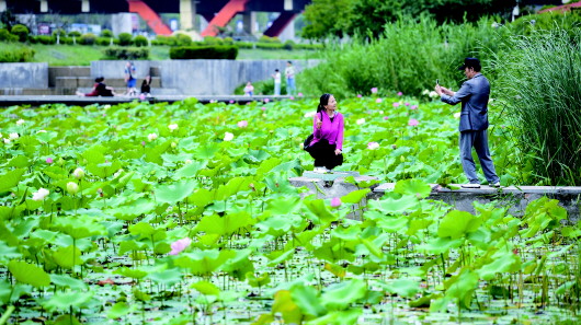 花开半夏,又是莲灿时。近期,在位于藉河风情线五里铺段湿地景观池中的荷花次第盛开。放眼望去,片片荷叶高低错落,朵朵红白相间的荷花或含苞待放、或竞相盛开,在阳光辉映下,显得格外娇艳,吸引不少慕名而来的游客漫步其中,赏花拍照。 新天水·天水日报记者 李旺旺 摄