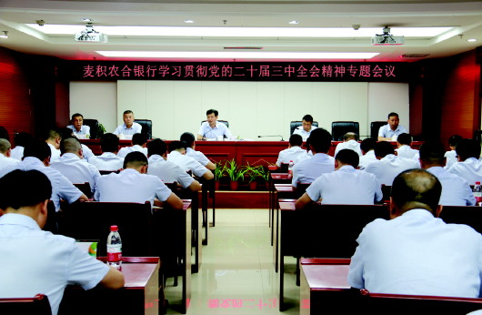 秦州农村合作银行 本报讯 7月27日,秦州农村合作银行召开党委会议,专题传达学习党的二十届三中全会精神,安排部署学习宣传贯彻落实工作。 会议集中学习了《中共中央关于进一步全面深化改革、推进中国式现代化的决定》《中国共产党第二十届中央委员会第三次全体会议公报》。传达省农信联社党委会议学习传达党的二十届三中全会精神相关情况,安排党委理论中心组研讨交流事项。 会议指出,党的二十届三中全会是在以中国式现代化全面推进强国建设、民族复兴伟业的关键时期举行的一次具有里程碑意义的会议。习近平总书记在全会上发表重要讲话,深刻阐述了进一步全面深化改革、推进中国式现代化的重大意义、总体要求、重要举措、根本保证等重大问题。全会通过的《中共中央关于进一步全面深化改革、推进中国式现代化的决定》,是新时代新征程上推动全面深化改革向广度和深度进军的总动员、总部署,是党的历史上又一纲领性文献。全行上下要深刻领会这次全会的历史地位、重大意义和核心内涵,领会全会一系列重大部署的丰富内涵与核心要义,坚定不移用全会精神统一思想、统一意志、统一行动,以秦州农合银行高质量发展助力全市区域金融服务中心建设,坚定不移推进中国式现代化。 会议强调,全行上下要将党的二十届三中全会精神的学习宣传贯彻作为当前和今后一个时期的重大政治任务,认真学习领会,全面抓好贯彻落实。要自觉将各项业务经营工作提升到进一步全面深化改革、推进中国式现代化这个大局中来思考、去谋划,当好进一步全面深化改革的坚定促进派、实干家,以更高标准、更大力度谋划推进中心工作。要找准工作的着力点和突破点,及时总结经验、固化成果、分析短板,有针对性提出下半年、下阶段推动各项重点工作的思路举措,确保党中央决策部署在秦州农合银行落地生根、见行见效。 会议要求,全行上下要迅速将思想和行动统一到全会精神上来,坚定捍卫“两个确立”、坚决做到“两个维护”,全面学习、全面把握、全面落实全会精神。 (甄果)张家川县信用联社 本报讯 近日,张家川回族自治县信用联社召开党委理论学习中心组(扩大)会议,专题学习中国共产党第二十届中央委员会第三次全体会议精神。党委班子成员、各党支部书记、部门经理及部分党员参加会议。 会上,张家川县信用联社负责人全文学习了《中国共产党第二十届中央委员会第三次全体会议公报》《中共中央关于进一步全面深化改革、推进中国式现代化的决定》,并对全社学习贯彻全会精神作出了安排部署。 会议指出,党的二十届三中全会是在全面推进强国建设、民族复兴伟业的关键时期召开的一次重要会议,系统谋划了进一步全面深化改革的新蓝图、新愿景、新举措,对于统一全党全军全国各族人民思想和意志,奋力推进中国式现代化,实现中华民族伟大复兴,具有重要里程碑意义。会议通过的《决定》是党的十八届三中全会以来全面深化改革的实践续篇,也是新征程推进中国式现代化的时代新篇,必将引领我们在推进中国式现代化的新征程上创造新的辉煌。 会议强调,党的二十届三中全会锚定推动金融高质量发展、加快建设金融强国的目标,对金融体制改革作出前瞻性、系统性的顶层设计,与习近平总书记关于金融工作的重要论述精神和中央金融工作会议精神一以贯之。全社党员干部要深刻领会把握进一步全面深化改革、推进中国式现代化的重大意义,自觉将各项工作融入全面深化改革大局。一要提高站位,及时跟进,迅速掀起学习热潮。二要聚焦主业,坚守定位,助力县域经济高质量发展。三要紧盯目标,坚持导向,细化优化金融服务举措。 (张苗苗)麦积农村合作银行 7月29日,麦积农村合作银行召开专题会议,学习贯彻党的二十届三中全会精神,领导班子成员、各网点负责人、各部门经理、机关全体人员共计90余人参加。会上,麦积农合银行主要负责同志领学了《中国共产党第二十届中央委员会第三次全体会议公报》《中共中央关于进一步全面深化改革、推进中国式现代化的决定》等,并按照省农信联社党委的工作部署,对全行做好学习宣传贯彻落实工作进行动员部署,提出明确要求。 冯倩 摄