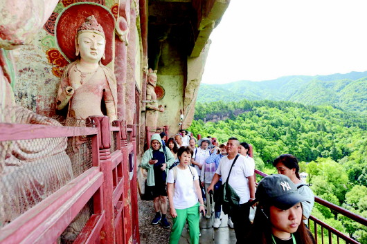 进入暑期旅游旺季,麦积山石窟吸引了众多国内外游客前来游览参观,一睹“东方雕塑陈列馆”和“东方微笑”的神韵。据统计,今年7月份,麦积山石窟购票人数达15.88万人次。为了提升游客体验感和满意度,麦积山大景区推出分时预约购票,开通港澳台游客、外籍游客线上线下购票通道,设置公共交通服务区,交通分流疏导等多项措施,切实提升景区旅游服务管理水平,提高游客通行效率。 新天水·天水日报记者 孙镇 摄